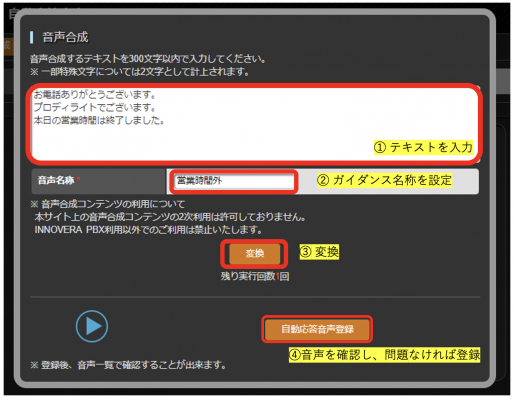 INNOVERAでは今回の機能追加により、管理画面上で文字入力することで音声合成による自然な音声ガイダンスの作成と設定がシームレスにできるようになりました。別途ファイルの保存や管理の必要がなく、そのまますぐに設定できるので、手間がかからず、クリアで聴きやすい音声ガイダンスが簡単に誰でも利用できるようになります。また、フリーソフト等で作成された音声ファイルは商用利用不可のものが多い一方で、本機能で作成されたものはINNOVERA上での利用に限り商用利用が可能です。
