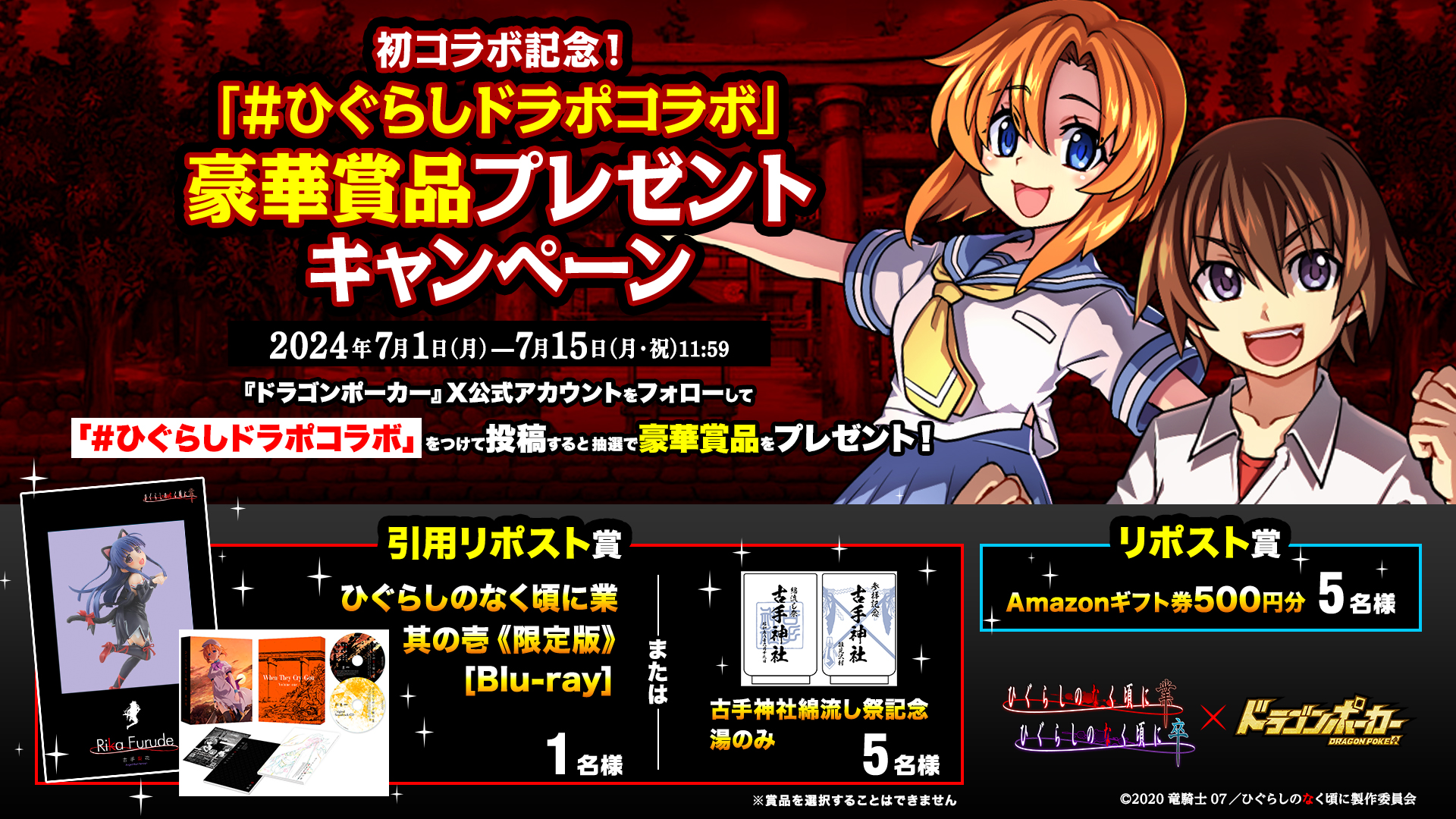 期間中、「#ひぐらしドラポコラボ」をつけて引用リポストしていただいた方の中から抽選でひぐらしのなく頃に業 其の壱(限定版)Blu-rayまたは古手神社綿流し祭記念湯のみをプレゼント!さらに、リポストをして頂いた方の中から抽選で5名様にAmazonギフト券をプレゼント!ふるってご参加ください。