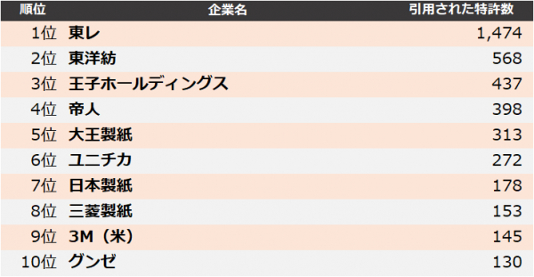 集計の結果、2023年に最も引用された企業は、1位 東レ、2位 東洋紡、3位 王子ホールディングスとなりました。