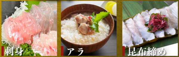 内容量 :甘鯛刺身(80g×2P)、甘鯛頭アラ(1P)、甘鯛昆布締め(80g×1P)、