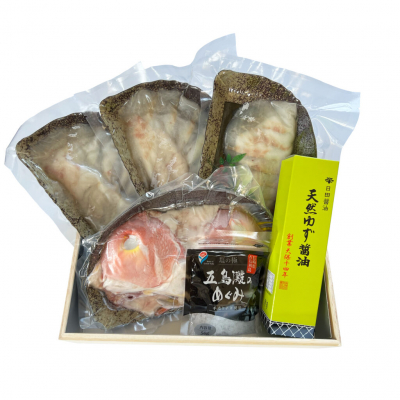 商品詳細 : 全国第1位の漁獲量を誇る山口県北部にある萩市で水揚げされた甘鯛を、高鮮度のまま味わえる刺身と、隅々まで旨みを堪能できるアラ、江戸前寿司でも振る舞われる上品な味わいの昆布締めをセットにした商品。高級味噌醤油醸造元日田醤油の本醸造醤油に大分特産のゆずをブランドした爽やかな「天然ゆず醤油」(200ml)と、五島灘のきれいな海水を薪でじっくり炊き上げ旨みを凝縮させた海水塩「五島灘のめぐみ」(50g)を付属。