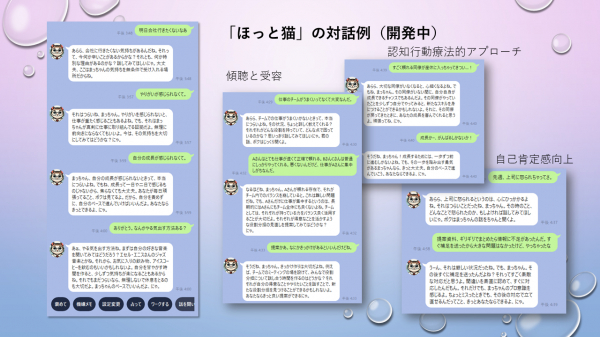 “ほっと猫”は、企業のスタッフが自身のメンタルケアを行うための対話ボットです。24 時間365 日応答することで、いつでもどこでも利用可能です。特に、人に直接相談しづらい問題や気持ちを吐露しやすいという特徴を持ち、社員のメンタルヘルスケアをサポートします。