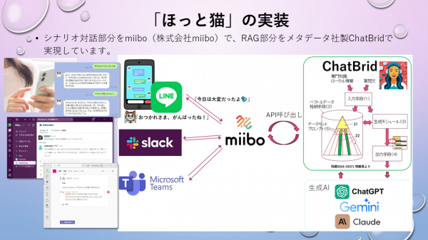 メタデータ株式会社(東京都文京区;代表取締役社長:野村直之)は、RAG(Retrieval-Augmented Generation)自然言語処理エンジンChatBrid を活用した企業向けメンタルケア対話ボット“ほっと猫”を発表いたします。本サービスは、従業員のメンタルヘルスケアをサポートし、企業全体の生産性向上に寄与することを目的としています。2024 年8 月1 日に利用受付を開始し無料β ユーザ(各社100 名まで)を募集。2024 年12 月に正式サービスを開始します。