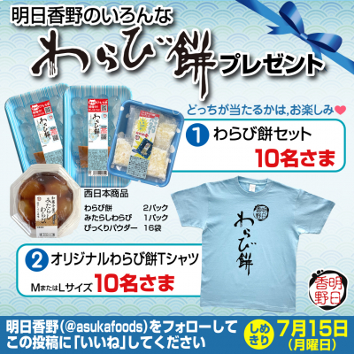 応募された方の中から抽選で10名様に西日本で人気の「わらび餅」、「みたらしわらび」に、東日本で販売されていた「ラムネわらび餅」に添付のびっくりパウダーを含む、わらび餅をたっぷり楽しめるセットをプレゼントいたします。