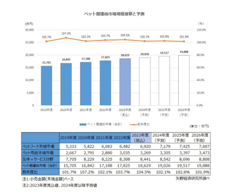 2024年度のペット関連総市場規模は、小売金額(末端金額)ベースで、前年度比102.1%の1兆9,026億円を予測する。