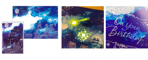 発売以来、SNSでの投稿数が多い人気のプレミアムレター「ザインディゴスカイ」のデザインが、オルゴールカードになって登場。音楽に合わせてLEDで星の部分が光ります。表紙には写真や動画に映えやすいホログラム箔入り!
