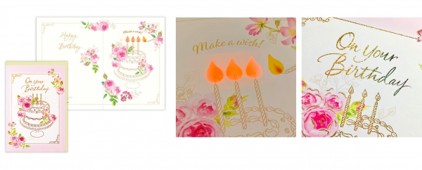 淡いピンクをベースに、バースデーケーキとバラを描いたエレガントなデザイン。音楽に合わせてLEDでキャンドルの部分が光ります。表紙には写真や動画に映えやすいホログラム箔入り!