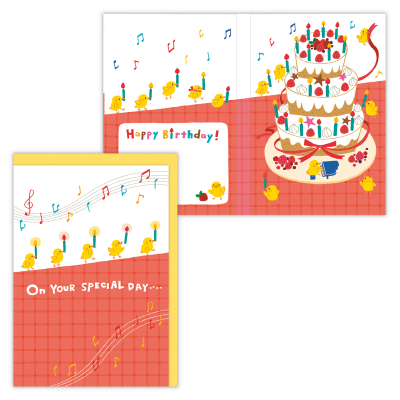 ひよこたちがバースデーケーキの飾りつけをしながら誕生日をお祝いしてくれる様子を描いた可愛らしいデザイン。ピヨピヨ可愛い鳴き声入り!