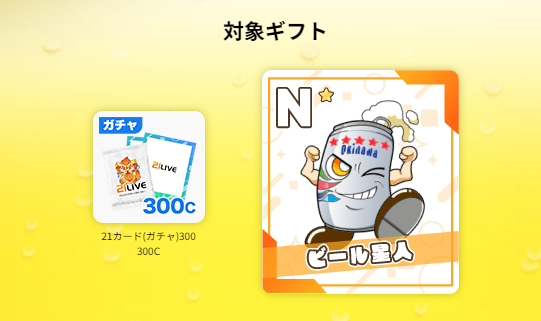 ビール星人は、21LIVEの人気ギフト「オキコレ」の「21カードガチャ300コイン」から呼ぶことができます。