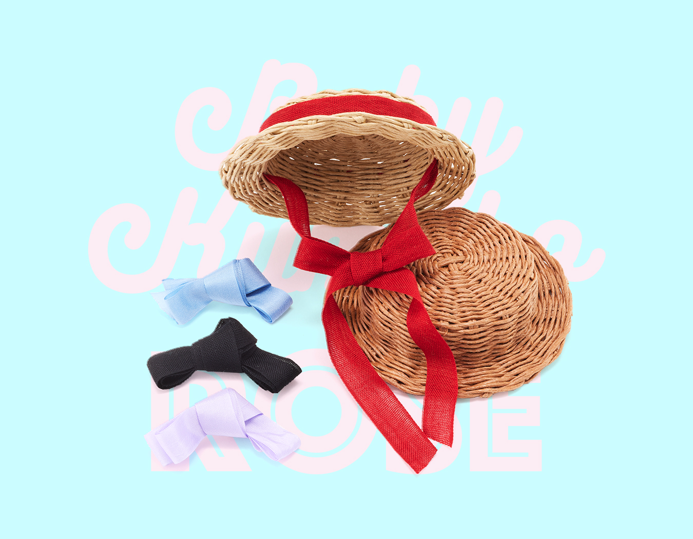 ロゼちゃんは赤チェックのワンピースにアイロンを効かせたママエプロンと刺繍入りおけいこバッグを合わせたトドラースタイル。ぴったりサイズで編んだ麦わら帽子には2色のリボンが付属し、お好きなスタイルで被せられます。前回と同じアンティークローズ色の三つ編みカールヘアウィッグは、LullabyPoemさんが一つずつ丁寧に仕上げてからお届けいたします。