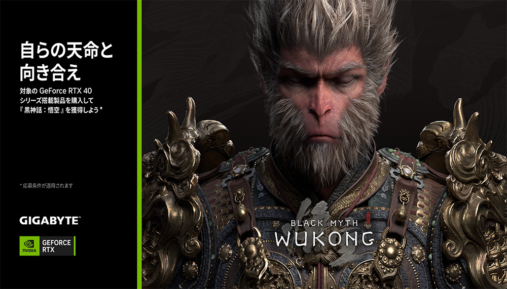 2024年7月10日 - GIGABYTE Technology Co., Ltd. 台湾・新北市 - コンピュータテクノロジーで世界をリードするGIGABYTE Technologyは、2024年7月9日~8月19日の期間中、対象のNVIDIA GeForce RTX 40シリーズ搭載製品をご購入いただいたユーザーに、Game Scienceの新作アクションRPGゲーム「Black Myth: Wukong」PC版(2024年8月20日発売予定)のゲームクーポンコードをもれなくプレゼントするゲームバンドルキャンペーンを実施いたします。