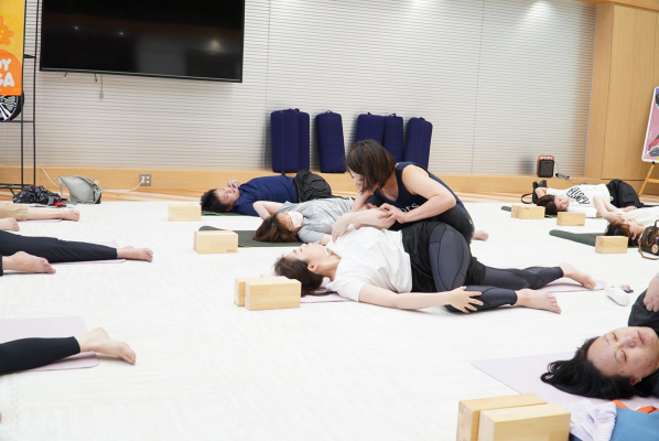 湿度も高く、気温の変化もある梅雨の時期は、自律神経も乱れがちになります。自律神経を整えるために効果的な呼吸法やポーズを行いました。初めて参加された方も、ヨガフェスタの開催を待ちに待って参加された方もおられ、終了後はスッキリした様子で姿勢や表情の変化もみられました。