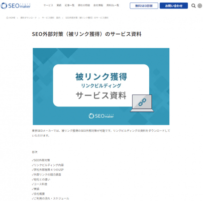 SEO対策(国内・海外)の専門会社のアドマノ株式会社(東京都豊島区、代表取締役社長:天野剛志)は、サービスサイト「東京SEOメーカー」において、【被リンク獲得サービス資料/SEO外部対策】の資料ダウンロードページを7月13日新規公開しました。