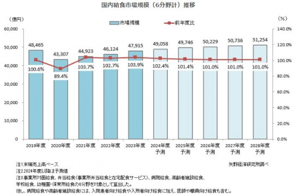 コロナ禍からの回復基調にある給食市場は、2024年度以降もプラス成長を予測する。2026年度に総市場は5兆円を超え、2028年度の市場規模は2023年度比107.0%の5兆1,254億円と予測した。