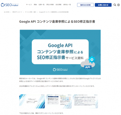 SEO対策(国内・海外)の専門会社のアドマノ株式会社(東京都豊島区、代表取締役社長:天野剛志)は、サービスサイト「東京SEOメーカー」において、【Google APIコンテンツ倉庫参照によるSEO修正指示書】の資料ダウンロードページを7月16日新規公開しました。