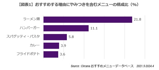 おすすめメニューデータベースは、最近食べた外食・中食メニューの中で、“他の人にもおすすめしたいメニュー”を消費者から収集したデータベースです。過去3年間に挙げられたやみつきに関連するデータを分析すると、特定の食材よりも強めの特徴的な味付けがやみつきを引き起こしていることが分かりました。
