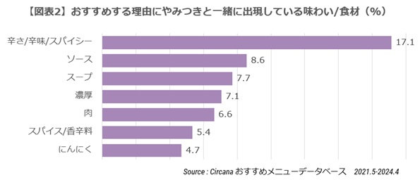 では、どのような要素があると消費者はやみつきの感覚を抱くのでしょうか。図表2は、おすすめする理由に“やみつき”が含まれるものを抽出し、やみつきと同時にコメントされている味わいや食材に関連するワードの上位をみたものです。