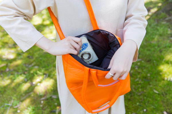 また、中綿によってクッション性が高いため、マルチポーチやオーガナイザーなど薄生地のものと併せて使うと、衝撃から守られる安心感があります。「パッフィングトート」には、オーガナイザーAIRと同じ生地を使っているため、オーガナイザーAIRとカラーを合わせてお使いいただくのもおすすめです。