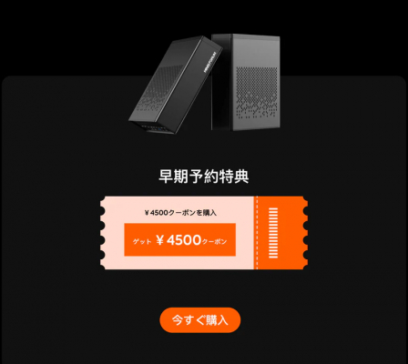 MS-A1は7月22日より予約開始します。今50円でご購入いただくと、4,500円のクーポンコードを入手できます。この特別なクーポンコードは、MS-A1をご購入いただく際、チェックアウトページでご利用いただけます。お得な早割キャンペーンは、7月10日から7月19日まで。この機会をお見逃しなく!