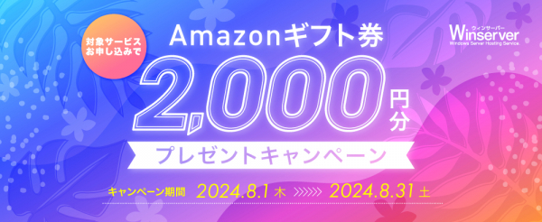 Winserver(ウィンサーバー/運営会社:アシストアップ株式会社、所在地:大阪府大阪市、代表取締役:青木 勝彦)は、2024年8木1日(木)~8木31日(土)の期間、Amazonギフト券キャンペーンを実施いたします。