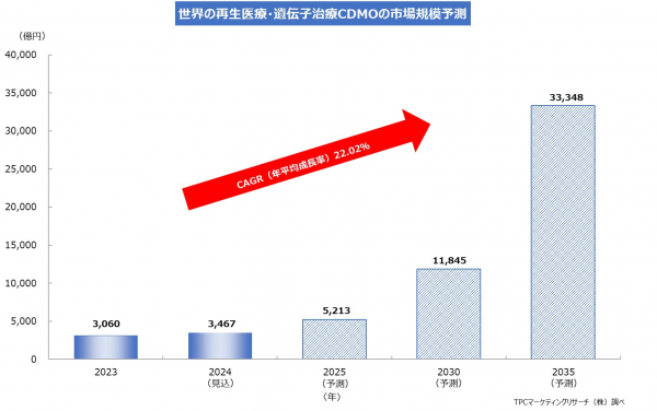 この程、TPCマーケティングリサーチ株式会社(本社=大阪市西区、代表取締役社長=松本竜馬)は、世界の再生医療・遺伝子治療CDMO市場について調査を実施、その結果を発表した。