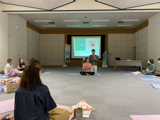 前半は、一般社団法人ボディセンス・インスティテュート 代表理事 高橋由紀が産前産後の養生法や赤ちゃんの抱き方について講義しました。