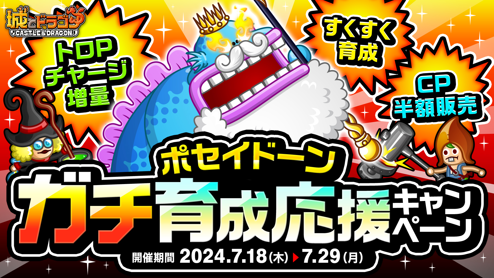 株式会社アソビズム(本社:東京都千代田区、代表取締役:大手智之)は、App Store・Google Playにて好評配信中の『城とドラゴン』で、2024年7月18日(火)に、ポセイドーンを対象とした「【ガチ】育成応援キャンペーン」を実施いたします。