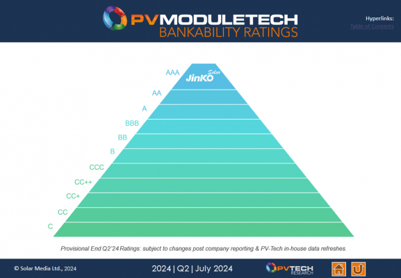 2024年7月15日、太陽光発電(PV)産業および蓄電池(ESS)産業の世界大手かつ革新的企業であるジンコソーラーは、2024年第2四半期のPV Module Tech バンカビリティ格付けで再び「AAA」評価を獲得したことを発表しました。ジンコソーラーは、その強力な研究開発能力、健全な財務実績、および広範な市場カバレッジにより、世界中の投資家と顧客の信頼を再び獲得しました。