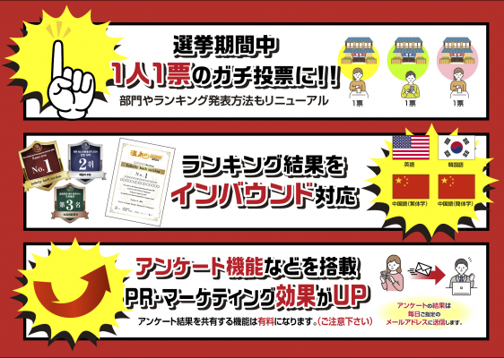 今年度からは、「投票方式」「エントリー部門の変更」「ランキング結果発表方式やインバウンド対応」更には「アンケート機能搭載」などの大幅なリニューアルを実施しております。