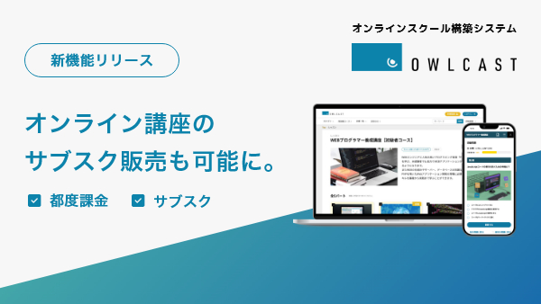 本機能のリリースにより、オウルキャストで構築したオンライン学習サービスで、読み物、動画、テスト等を組み合わせたレッスンを、都度課金とサブスクリプションの両方式で販売できるようになります。