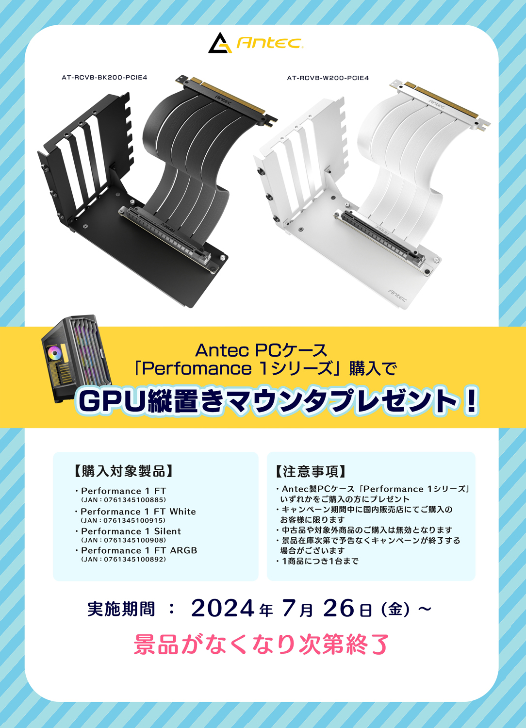 株式会社リンクスインターナショナル(本社:東京都千代田区、代表取締役:川島義之)は、好評発売中のAntec製PCケース「Performance 1シリーズ」のいずれかを購入した方に、GPU縦置きマウンタプレゼントキャンペーンを2024年7月26日(金)より開始いたします。※景品がなくなり次第終了となります。