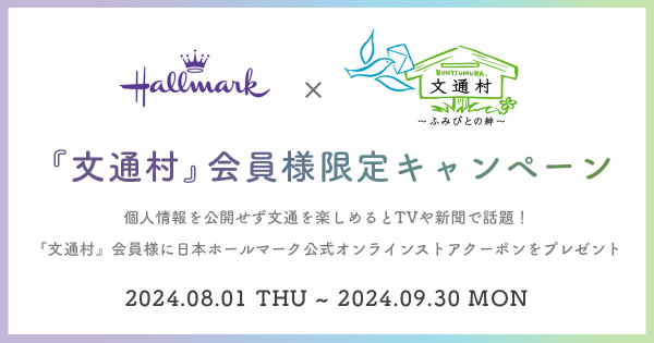 株式会社日本ホールマーク(本社・東京都港区芝)は、住所氏名を使わない安心文通コミュニティ「文通村」(https://www.fumibito.com/)とのタイアップキャンペーンを8月1日(木)より公式オンラインストアにて実施いたします。