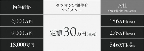 本サービスの特徴は、売買価格に連動した業界の標準的な報酬体系に比べて大幅に安い金額設定の媒介報酬だ。タワマン定額仲介マイスター経由の問い合わせで売却が成功した場合に、一律で定額30万円(税別)の媒介報酬でサービスを提供する。
