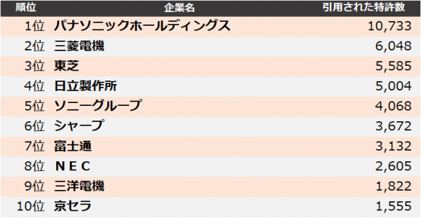 集計の結果、2023年に最も引用された企業は、1位 パナソニックホールディングス、2位 三菱電機、3位 東芝となりました。