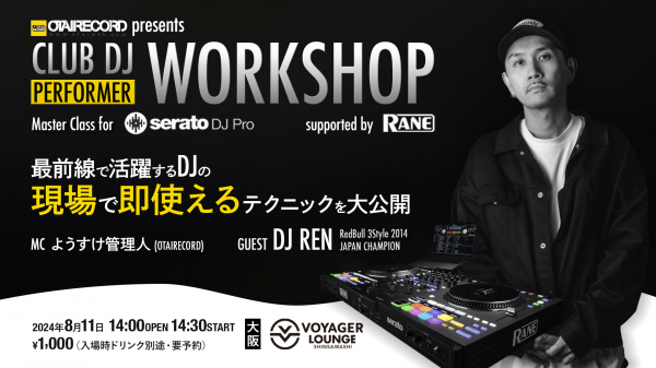 オタイオーディオ株式会社が運営するOTAIRECORDが2024/8/11(SUN)に大阪のVOYAGER LOUNGE OSAKAにて「OTAIRECORD presents CLUB DJ PERFORMER WORKSHOP supported by RANE」を開催いたします。