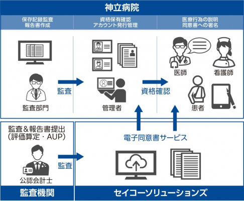 セイコーソリューションズ株式会社(代表取締役社長:関根 淳、本社:千葉県千葉市、以下 セイコーソリューションズ)は、医療法人社団青洲会神立病院(理事長:平塚 圭介:茨城県土浦市 以下 神立病院)と、株式会社大塚商会(代表取締役社長:大塚 裕司:東京都千代田区 以下 大塚商会)と共同で、セイコーソリューションズが提供する電子同意書サービスを手術・検査・処置に対する説明と同意に用いる実証を行い、書面同意に代えた実務運用が行えることを確認しました。本実証では、医師・看護師等の資格確認が行われた電子署名を用い、公認会計士による評価と検証手続きを行うことで、医療情報ガイドラインへの準拠性を確認しました。公認会計士による医療情報ガイドラインへの準拠性が確認された電子同意書サービスは国内初(*)となります。