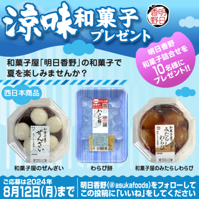 ぜひ、ご応募いただき、看板商品「わらび餅」、和菓子屋明日香野がお届けする「和菓子屋のシリーズ」から「ぜんざい」、「みたらしわらび」の冷やして美味しい和菓子で夏をお楽しみください。