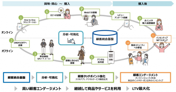 店頭接客向けの会員管理アプリや、BIアプリ連携、担当者通知、AI活用、顧客にあわせたパーソナライズ、顧客ID統合、NFT利用など、様々なサービス拡張に対応可能です。