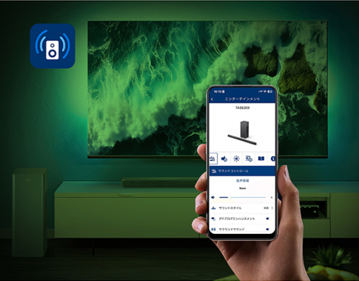 専用アプリ「Philips entertainment」をダウンロードし接続することで、スマホからさまざまな操作が可能になります。 音声・音楽・映画・スタジアム・と4パターンのイコライザー設定や、バス、トレブルの微調整などあなたにあった最適な音響をカスタマイズ可能です。