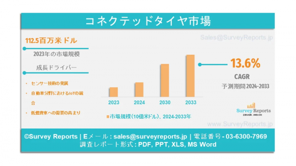 サーベイレポート合同会社は、コネクテッドタイヤ市場の予測評価を提供する調査レポート「コネクテッドタイヤ市場 コンポーネント別セグメント(TPMS、加速度計センサー、ひずみゲージセンサー、RFIDチップ、その他センサー);車両タイプ別(乗用車、商用車)-世界市場分析、動向、機会、予測、2024-2033年」を2024年8月に発行したと発表しました。コネクテッドタイヤ市場の成長促進要因、市場機会、課題、脅威など、いくつかの主要な市場ダイナミクスを紹介しています。
