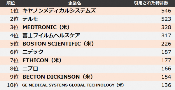 医療機器業界の被引用件数上位30社のランキング