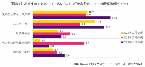 また、最もレモンと組み合わせられていたスパゲッティ・パスタは、直近1年でその比率がさらに増加傾向となっています。パスタの具材として、レモンは意外な組み合わせに思えますが、メニュー名をみると、クリーム系のパスタが多く、エビやサーモン等の海鮮具材と合わせて、「クリーミーで濃厚だけど、レモンがさっぱりしていて美味しい」等とコメントされています。