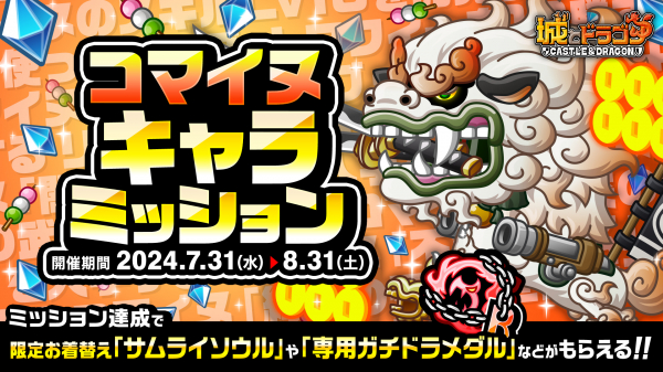 7月31日(水)より、新キャラ「コマイヌ」の登場を記念したログインボーナスやキャラミッションなどのキャンペーン・イベントが開催中です。キャラミッションでしか獲得できない限定お着替え「サムライソウル」といったアイテムも登場しますので、ぜひ期間内に城ドラをプレイしてみましょう。