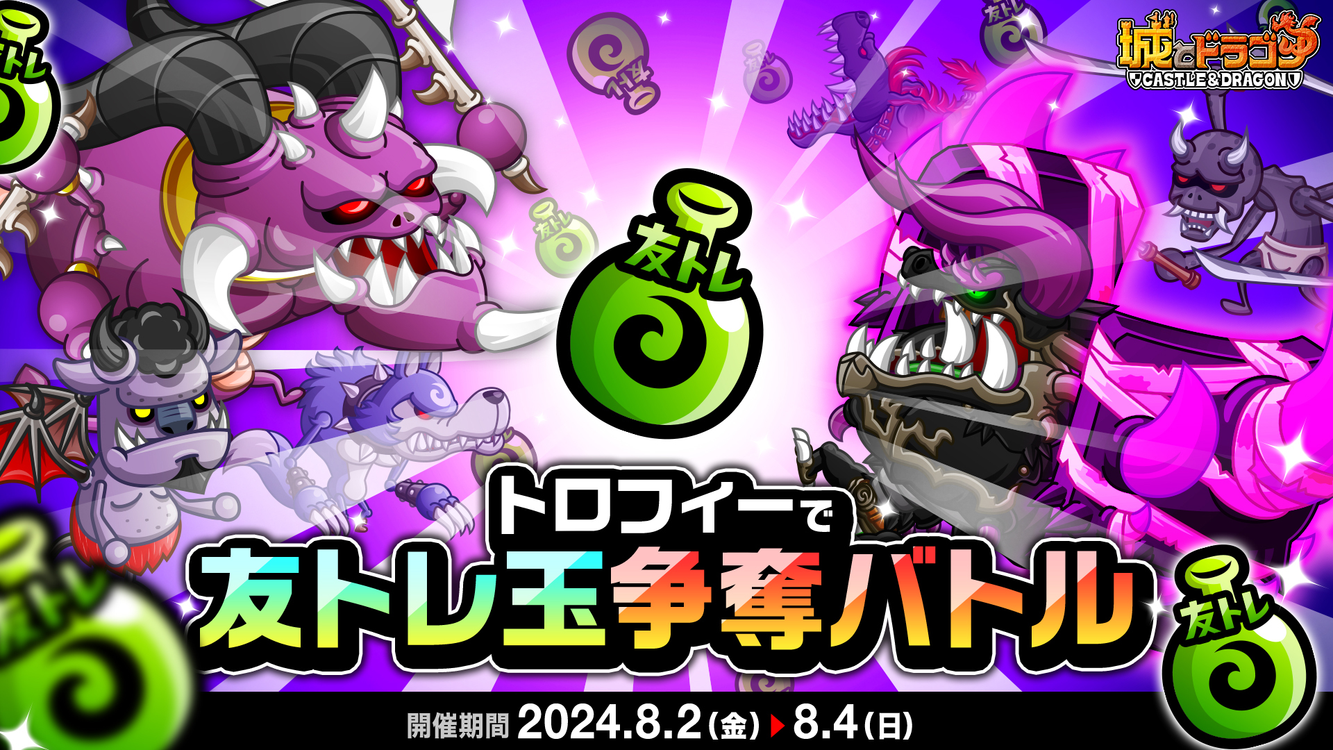 株式会社アソビズム(本社:東京都千代田区、代表取締役:大手智之)は、App Store・Google Playにて好評配信中の『城とドラゴン』で、「トロフィーで友トレ玉争奪バトル」を2024年8月2日(金)より開催いたします。