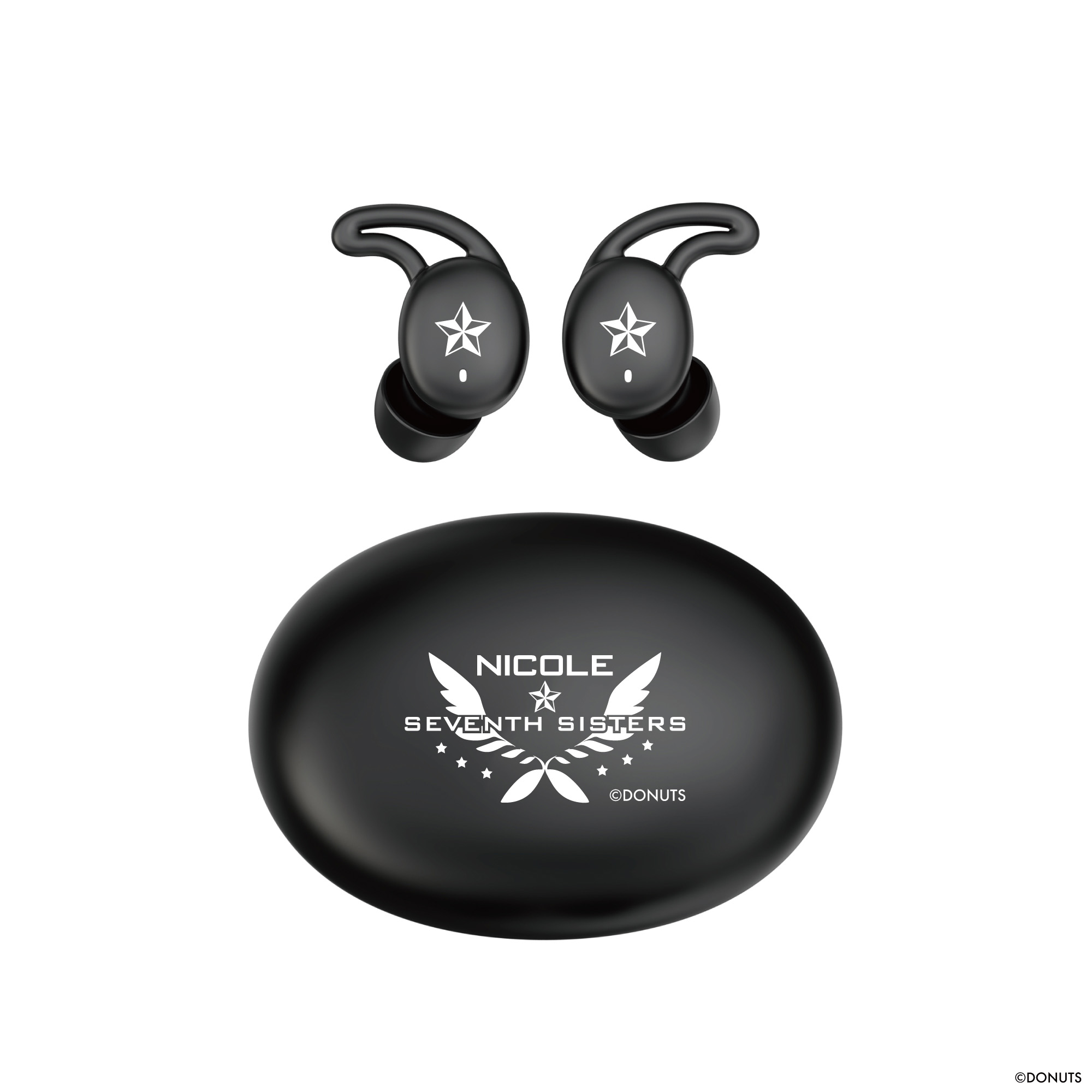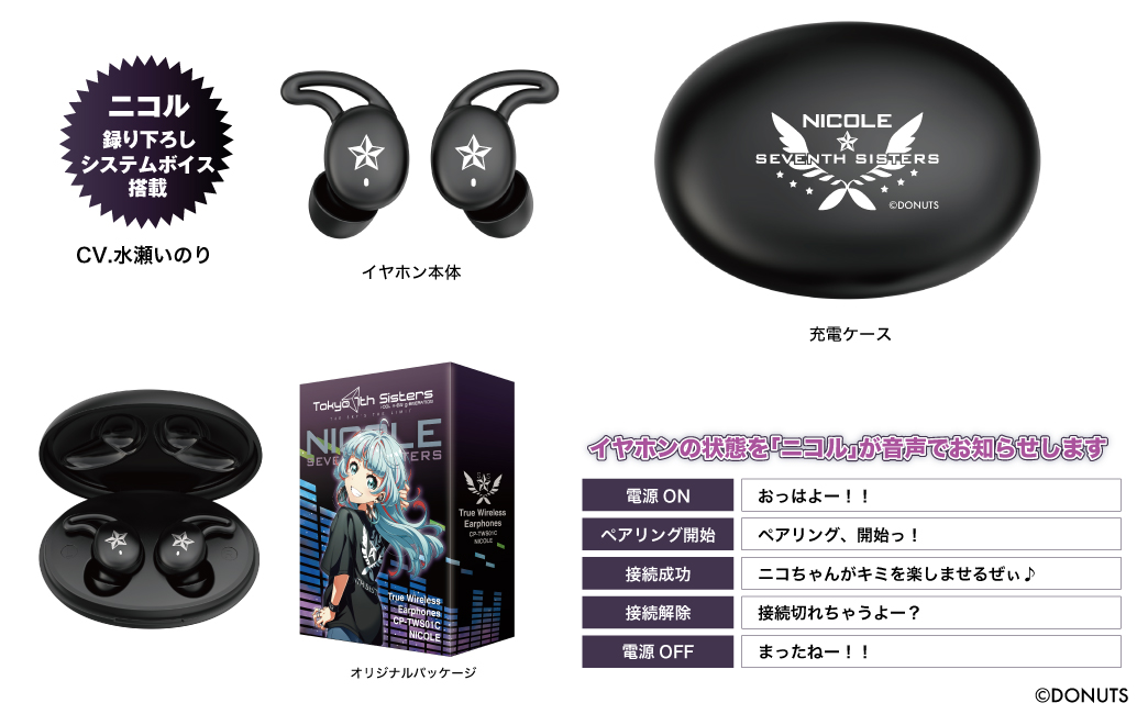 充電ケースの天面にはニコルのモチーフと「SEVENTH SISTERS」をデザイン、左右ハウジングは星をレイアウトし、作品の世界観を表現しています。さらにパッケージは「七咲ニコル」描き下ろしイラストを使用したオリジナルデザインになっています。