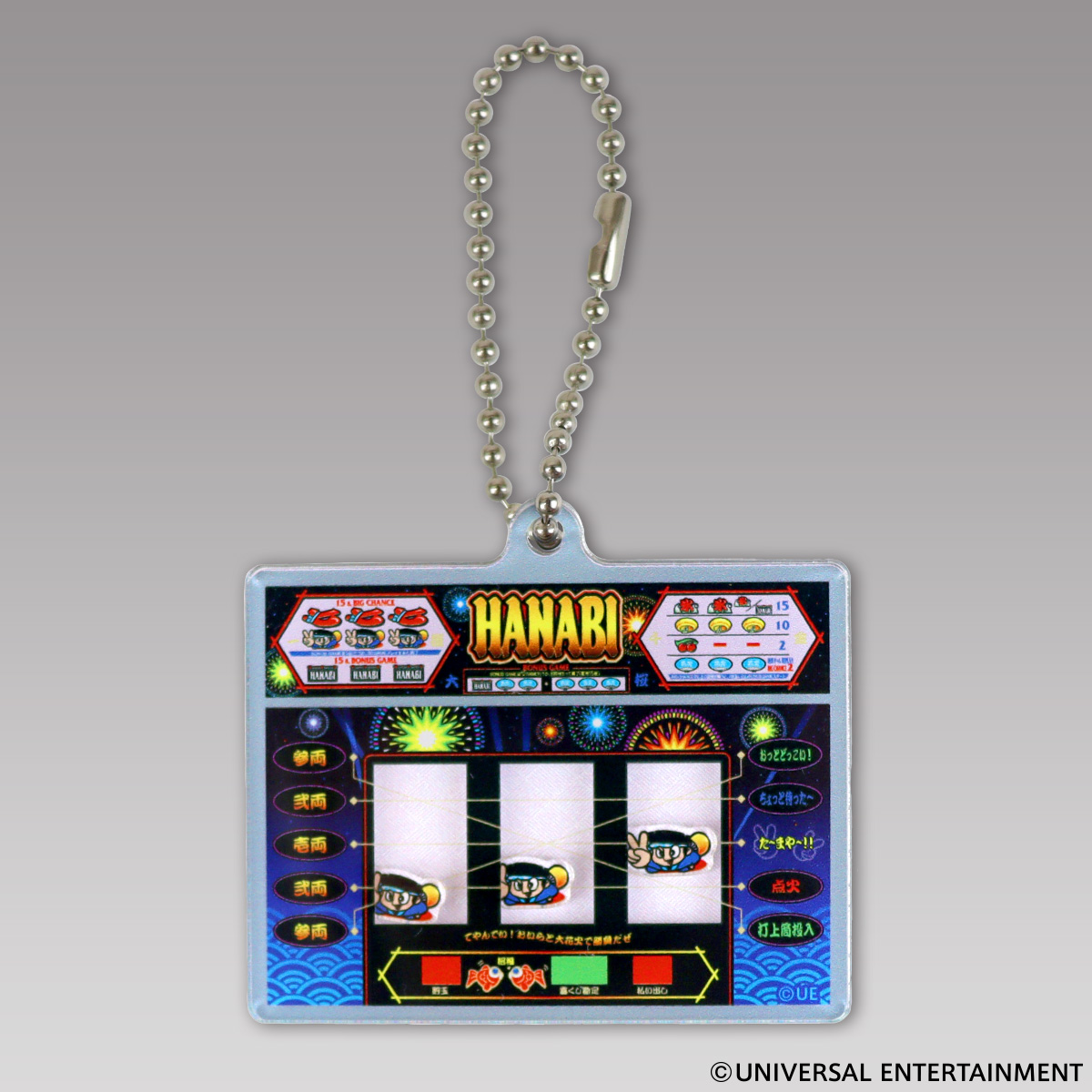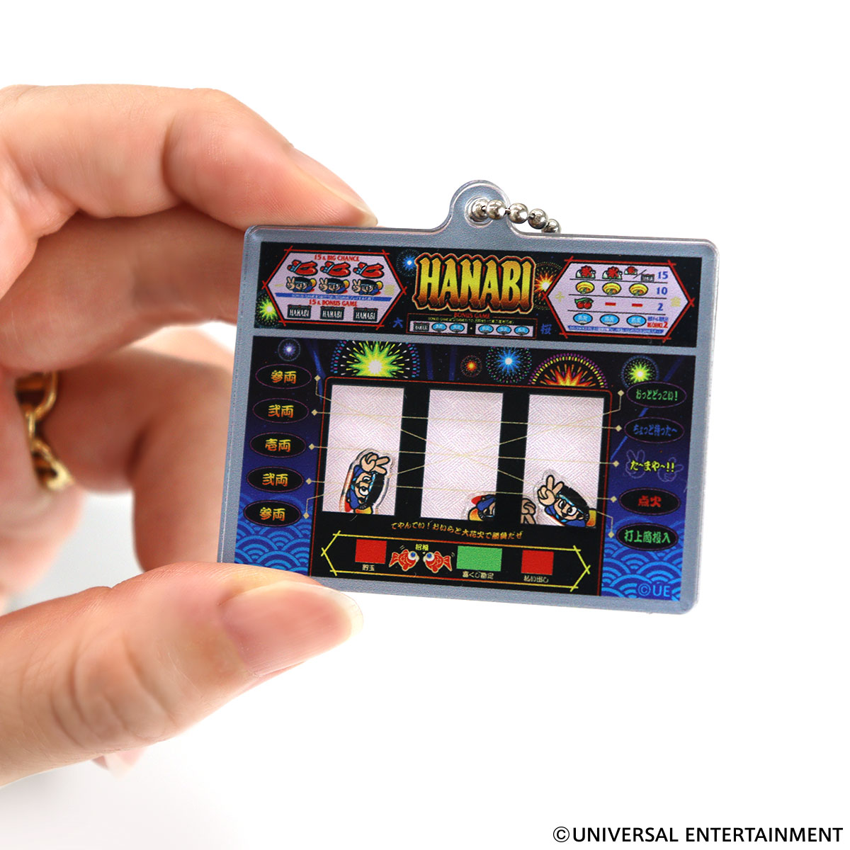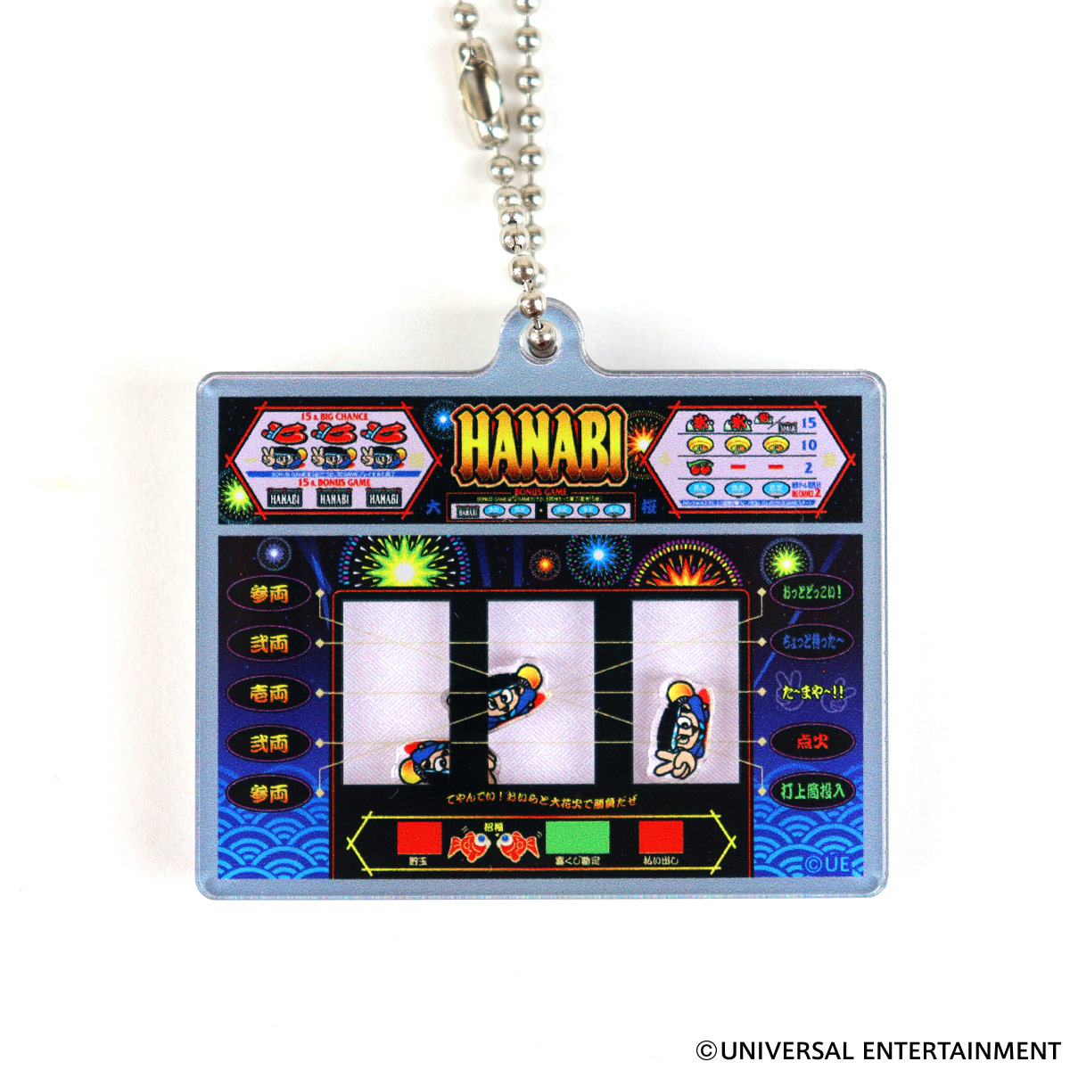 アクリルで作ったハナビ筐体の中でドンちゃん図柄が動き回る、なんとも楽しいキーホルダー。
