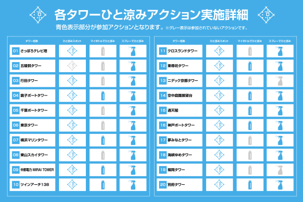 そこで、本プロジェクトと全日本タワー協議会が連携し、各タワーが位置する「街のひと涼みスポット」として、インバウンドを含む観光客に向けた、地球にやさしい熱中症対策を推進して参ります。具体的には3つのひと涼みアクションを実施致します。
