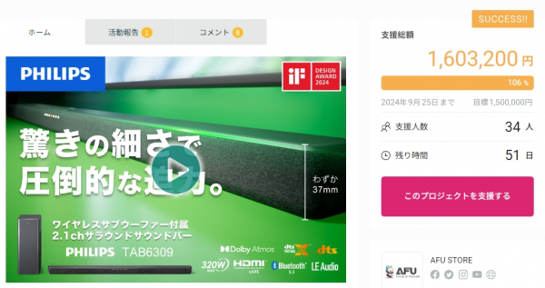 Philips TAB6309がクラウドファンディングサイトGREEN FUNDINGにて2024年8月4日に目標金額を達成。