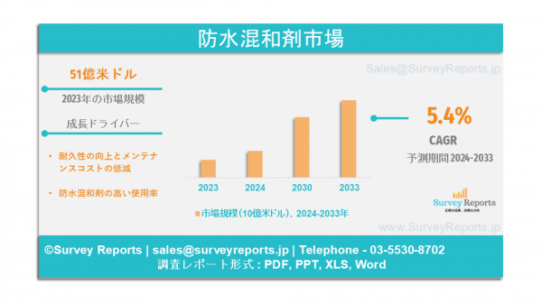 サーベイレポート合同会社は、2024年8月発行の調査レポート「防水用混和剤市場のタイプ別セグメント(結晶性、孔閉塞性、疎水性または撥水性材料、その他)」を発表しました; エンドユーザー産業別(タンク、下水・水処理プラント、トンネル・地下鉄システム、バルコニー、地下アーチ、橋梁デッキ、二次封じ込め構造物、地下室、貯水池、プレキャスト部品、スイミングプール、駐車構造物) - 防水混和剤市場の予測評価を提供する2024~2033年の世界市場分析、動向、機会および予測。防水混和剤市場の成長促進要因、市場機会、課題、脅威など、いくつかの主要な市場ダイナミクスを紹介しています。