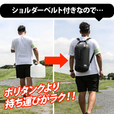 いざという時、ウォータータンクに。最大容量20リットル!ショルダーベルト付きなので、背負えて運びやすい。アウトドアにも最適。